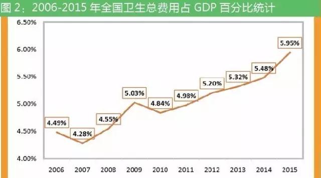 从近10年(2006~2015)统计数据可见,卫生总费用占GDP比重更是逐年增速。一方面说明我国医疗健康水平的提高,另一方面也提示控制合理增速的重要性。根据《2015年我国卫生和计划生育事业发展统计公报》,2015年全国卫生总费用预计达40,587.7亿元,其中:政府卫生支出12,533.0亿元(占30.88%),社会卫生支出15,890.7亿元(占39.15%),个人卫生支出12,164.0亿元(占29.97%)。人均卫生总费用2952元,卫生总费用更是占到GDP的将近6.0%。