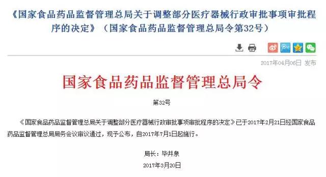 次日,食品药品监管总局发布总局令32号《国家食品药品监督管理总局关于调整部分医疗器械行政审批事项审批程序的决定》(以下简称32号令《决定》),对部分医疗器械审批事项审批程序作出调整。