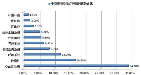 数据显示,2015年中国中药市场中,心脑血管系统领域的销售份额最大,占中药市场的34.2%,其次为肿瘤科和呼吸系统领域。