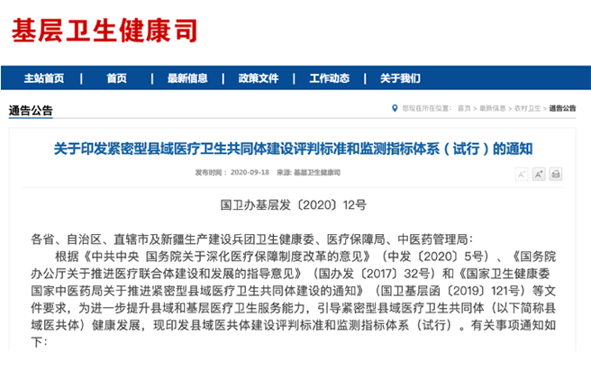2019年5月,国家卫生健康委印发《关于推进紧密型县域医疗卫生共同体建设的通知》,提出到2020年底,在500个县初步建成新型县域医疗卫生服务体系。随后,又公布全国567个县和两个省为医共体试点单位。
