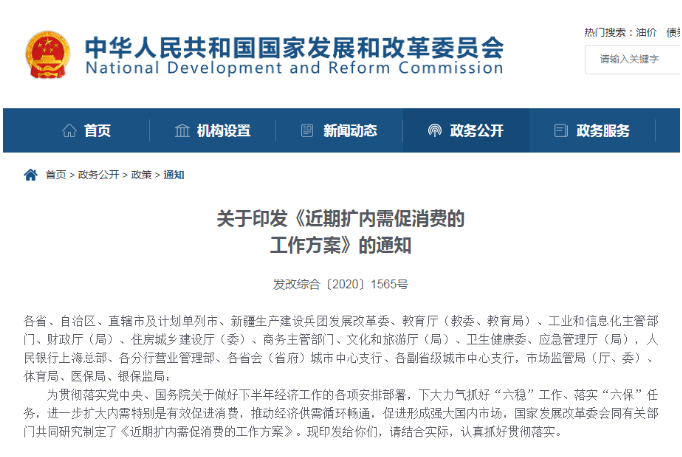 10月29日,国家发改委官网发布《关于印发<近期扩内需促消费的工作方案>的通知》(以下称《通知》)。为抓好“六稳”工作、落实“六保”任务,进一步扩大内需特别是有效促进消费,推动经济供需循环畅通,促进形成强大国内市场,包括国家发改委在内的14个部门共同研究制定了该方案。